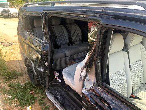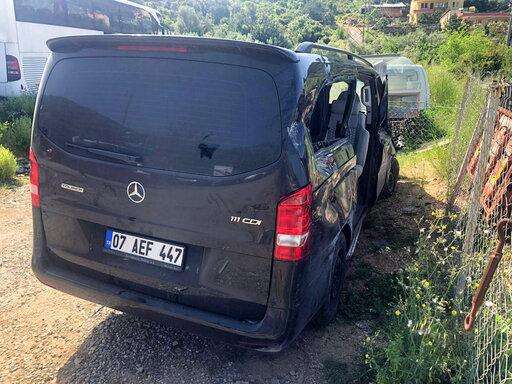 A view of the damaged vehicle involved in an accident near Alanya in Antalya province, Turkey, Monday, April 29, 2019.Czech Republic international Josef Sural was killed and six other Alanyaspor players were injured Monday when their van was involved in an accident on the way home from a Turkish league soccer match. (IHA agency via AP)
