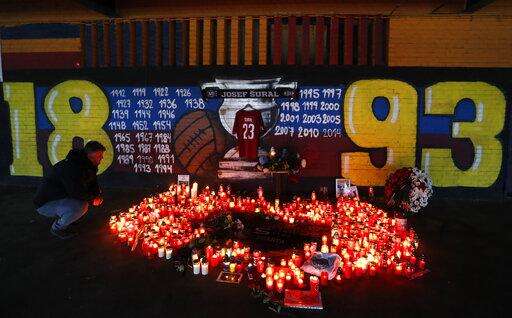 A man looks at candles placed near the Sparta stadium in Prague, Czech Republic, Monday, April 29, 2019, after the death of Czech soccer player Josef Sural. 28-year old Sural died and six other Alanyaspor players were injured after their van was involved in an auto accident at the town of Alanya, on Turkey's Mediterranean coast, on their way home from a game in Turkey's top-tier soccer league. (AP Photo/Petr David Josek)
