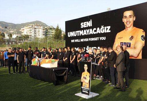 Soccer players of Alanyaspor gather for a memorial for their teammate Czech Republic's Josef Sural, in Alanya in Antalya province, Turkey, Monday, April 29, 2019. Sural was killed and six other Alanyaspor players were injured Monday when their van was involved in an accident on the way home from a Turkish league soccer match. (DHA via AP)