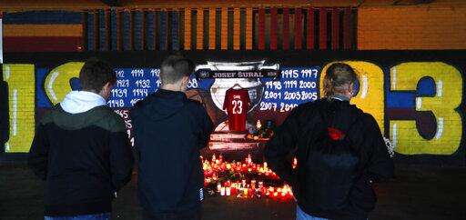 People look at candles placed near the Sparta stadium in Prague, Czech Republic, Monday, April 29, 2019, after the death of Czech soccer player Josef Sural. 28-year old Sural died and six other Alanyaspor players were injured after their van was involved in an auto accident at the town of Alanya, on Turkey's Mediterranean coast, on their way home from a game in Turkey's top-tier soccer league. (AP Photo/Petr David Josek)