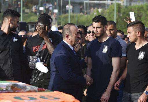 Turkey's Foreign Minister Mevlut Cavusoglu speaks to soccer players of Alanyaspor gathered for a memorial for their teammate Czech Republic's Josef Sural, in Alanya in Antalya province, Turkey, Monday, April 29, 2019. Sural was killed and six other Alanyaspor players were injured Monday when their van was involved in an accident on the way home from a Turkish league soccer match. (DHA via AP)
