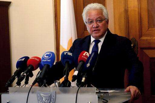 Cyprus' Justice Minister Ioanas Nicolaou talks to the media after a meeting with Cyprus' president Nicos Anastasiades at the presidential palace in capital Nicosia, Cyprus, Thursday, May 2, 2019. Nicolaou has resigned over the case of a serial killer who has confessed to killing seven foreign women and girls amid mounting reports that police had bungled their investigation when some of the victims were initially reported missing. (AP Photo/Philippos Christou) The Associated Press