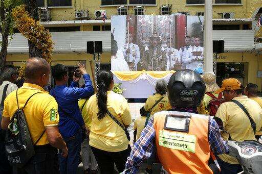 Thai well-wishers hold portrait of Thailand's King Maha Vajiralongkorn outside Grand Palace in Bangkok, Thailand, Saturday, May 4, 2019. After a more than a decade of political strife, including a military coup and a contentious election less than two months ago, the people of Thailand are witnessing this weekend the coronation of King Maha Vajiralongkorn in a centuries-old royal tradition that last happened seven decades ago. (AP photo/Sakchai Lalit)