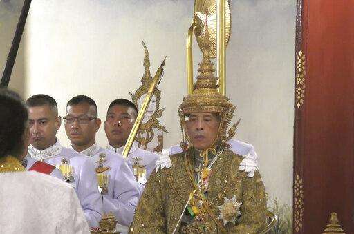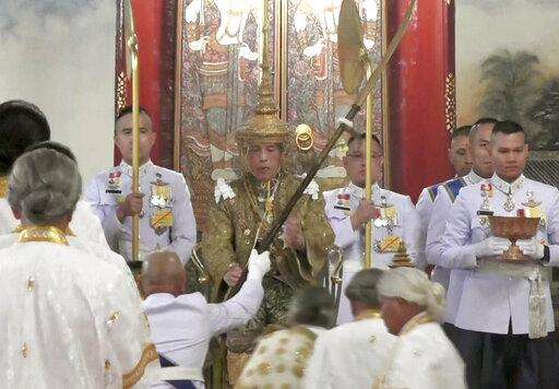 In this image made from the video, Thailandâs King Maha Vajiralongkorn sits on the throne as he is officially crowned king at the Grand Palace, Saturday, May 4, 2019, in Bangkok, Thailand. Saturday began three days of elaborate centuries-old ceremonies for the formal coronation of Vajiralongkorn, who has been on the throne for more than two years following the death of his father, King Bhumibol Adulyadej, who died in October 2016 after seven decades on the throne. (Thai TV Pool via AP)