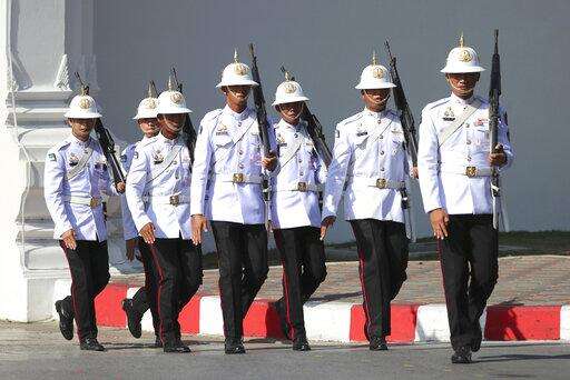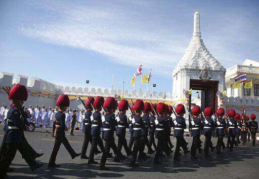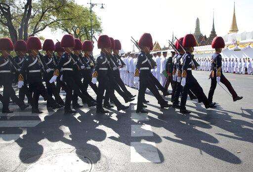 Thai royal guard walk into Grand Palace in Bangkok, Thailand, Saturday, May 4, 2019. After a more than a decade of political strife, including a military coup and a contentious election less than two months ago, the people of Thailand are witnessing this weekend the coronation of King Maha Vajiralongkorn in a centuries-old royal tradition that last happened seven decades ago. (AP photo/Sakchai Lalit)