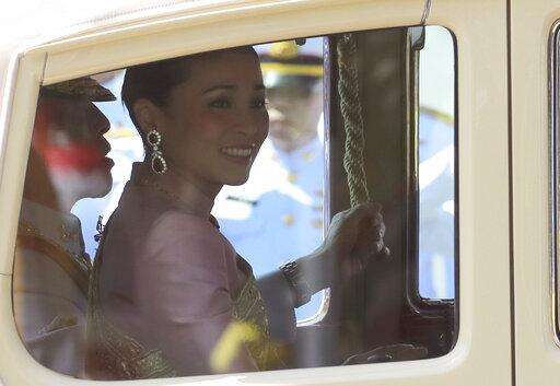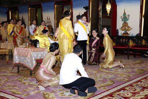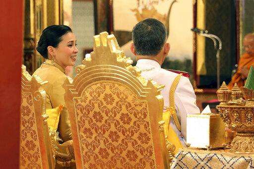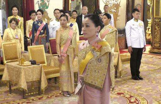 In this image made from video, Thailandâs Queen Suthida, foreground, stands in front of King Maha Vajiralongkorn as he is officially crowned king at the Grand Palace, Saturday, May 4, 2019, in Bangkok, Thailand. Saturday began three days of elaborate centuries-old ceremonies for the formal coronation of Vajiralongkorn, who has been on the throne for more than two years following the death of his father, King Bhumibol Adulyadej, who died in October 2016 after seven decades on the throne. (Thai TV Pool via AP)