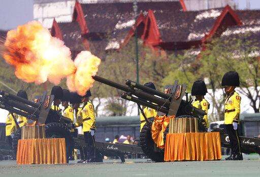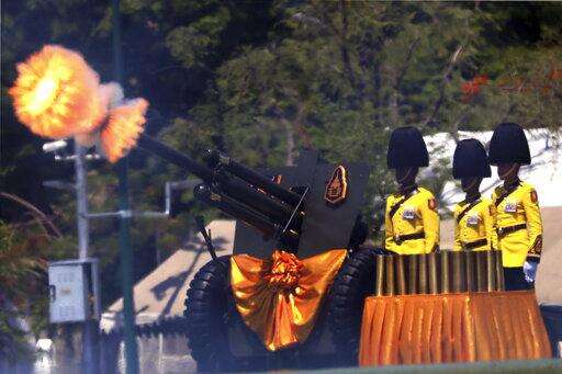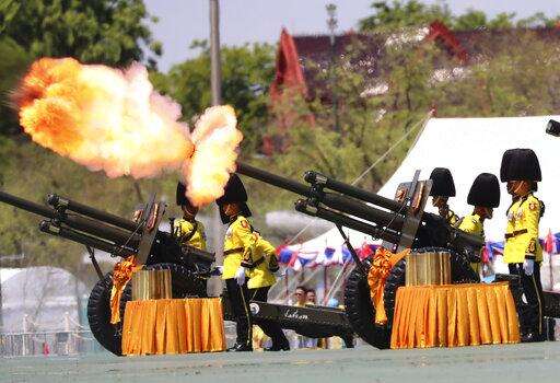 Royal Guards fire cannons in honour of Thailand's King Maha Vajiralongkorn Saturday, May 4, 2019, in Bangkok, Thailand. Saturday began three days of elaborate centuries-old ceremonies for the formal coronation of Vajiralongkorn, who has been on the throne for more than two years following the death of his father, King Bhumibol Adulyadej, who died in October 2016 after seven decades on the throne. (AP Photo/Sakchai Lalit)