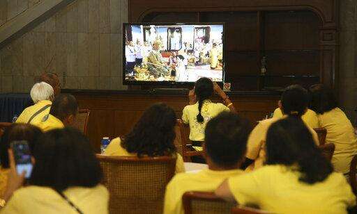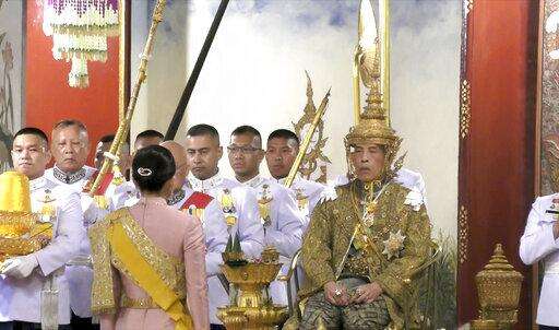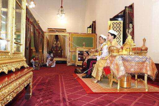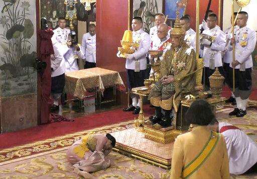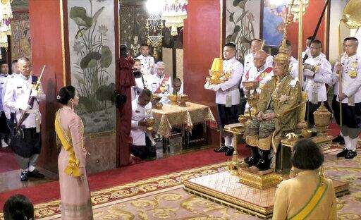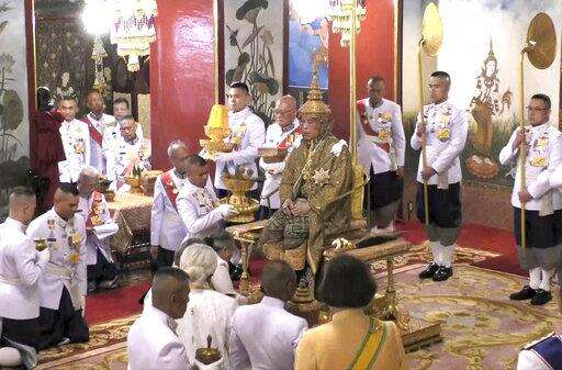 In this image made from video, Thailandâs King Maha Vajiralongkorn sits on the throne in front of Queen Suthida as he is officially crowned king at the Grand Palace, Saturday, May 4, 2019, in Bangkok, Thailand. Saturday began three days of elaborate centuries-old ceremonies for the formal coronation of Vajiralongkorn, who has been on the throne for more than two years following the death of his father, King Bhumibol Adulyadej, who died in October 2016 after seven decades on the throne. (Thai TV Pool via AP)