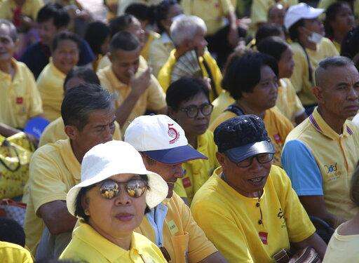 Thai people gather outside Grand Palace in Bangkok, Thailand, Saturday, May 4, 2019. After a more than a decade of political strife, including a military coup and a contentious election less than two months ago, the people of Thailand are witnessing this weekend the coronation of King Maha Vajiralongkorn in a centuries-old royal tradition that last happened seven decades ago. (AP photo/Sakchai Lalit)