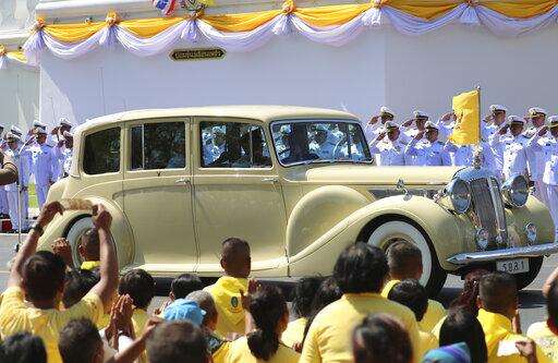 Thailand's King Maha Vajiralongkorn and Queen Suthida sitting inside a royal car drive past people Saturday, May 4, 2019, in Bangkok, Thailand. Saturday began three days of elaborate centuries-old ceremonies for the formal coronation of Vajiralongkorn, who has been on the throne for more than two years following the death of his father, King Bhumibol Adulyadej, who died in October 2016 after seven decades on the throne. (AP Photo/Sakchai Lalit)