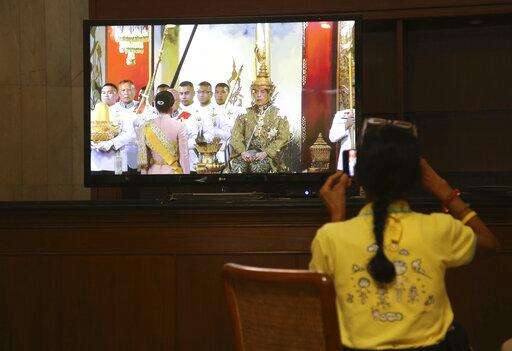 Thai people watch television broadcasting that Thailand's King Maha Vajiralongkorn, is officially crowned king at the Grand Palace, Saturday, May 4, 2019, in Bangkok, Thailand. Saturday began three days of elaborate centuries-old ceremonies for the formal coronation of Vajiralongkorn, who has been on the throne for more than two years following the death of his father, King Bhumibol Adulyadej, who died in October 2016 after seven decades on the throne. (AP Photo/Rapeephat Sitchailapa)