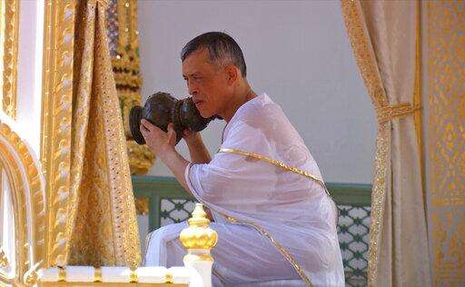 In this image made from the video, Thailandâs King Maha Vajiralongkorn attends the royal purification ceremony at the Grand Palace, Saturday, May 4, 2019, in Bangkok, Thailand. Saturday began three days of elaborate centuries-old ceremonies for the formal coronation of Vajiralongkorn, who has been on the throne for more than two years following the death of his father, King Bhumibol Adulyadej, who died in October 2016 after seven decades on the throne. (Thai TV Pool via AP)