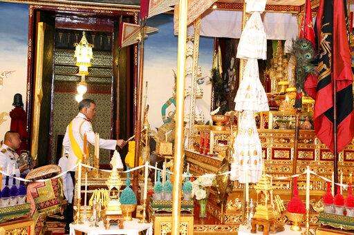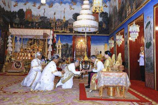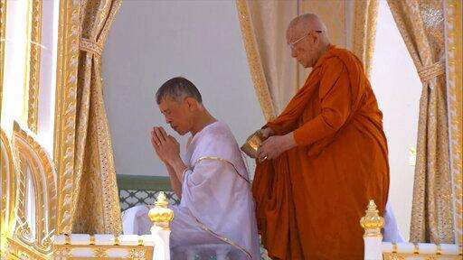 In this image made from the video, Thailandâs King Maha Vajiralongkorn, left, attends the royal purification ceremony at the Grand Palace, Saturday, May 4, 2019, in Bangkok, Thailand. Saturday began three days of elaborate centuries-old ceremonies for the formal coronation of Vajiralongkorn, who has been on the throne for more than two years following the death of his father, King Bhumibol Adulyadej, who died in October 2016 after seven decades on the throne. (Thai TV Pool via AP)