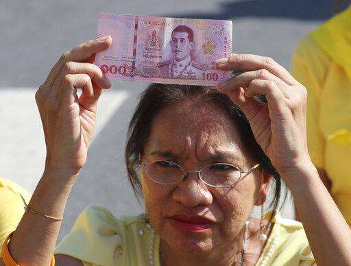 A Thai woman holds a banknote portrait of Thailand's King Maha Vajiralongkorn outside Grand Palace in Bangkok, Thailand, Saturday, May 4, 2019. After a more than a decade of political strife, including a military coup and a contentious election less than two months ago, the people of Thailand are witnessing this weekend the coronation of King Maha Vajiralongkorn in a centuries-old royal tradition that last happened seven decades ago.(AP photo/Sakchai Lalit)