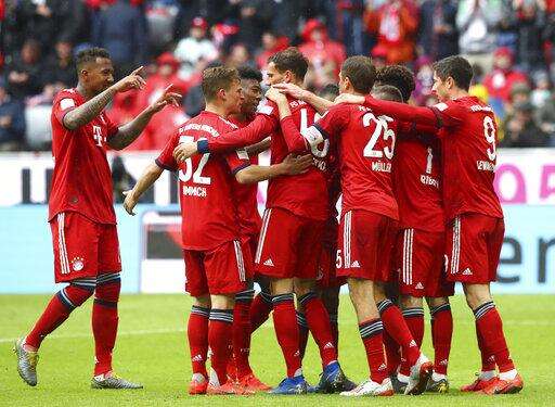 Bayern's players celebrate after scoring their side's third goal during the German Bundesliga soccer match between FC Bayern Munich and Hannover 96 in Munich, Germany, Saturday, May 4, 2019. (AP Photo/Matthias Schrader) The Associated Press