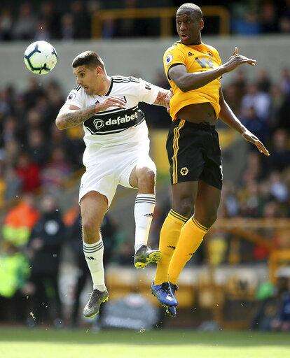 Fulham's Aleksandar Mitrovic, left, and Wolverhampton Wanderers' Willy Boly battle for the ball during the English Premier League soccer match at Molineux, Wolverhampton, England, Saturday May 4, 2019. (Nick Potts/PA via AP) The Associated Press