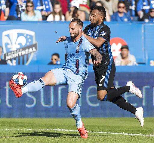 Montreal Impact's Harry Novillo, left, challenges New York City FC's Alexander Callens during first half of an MLS soccer game in Montreal, Saturday, May 4, 2019. (Graham Hughes/The Canadian Press via AP)