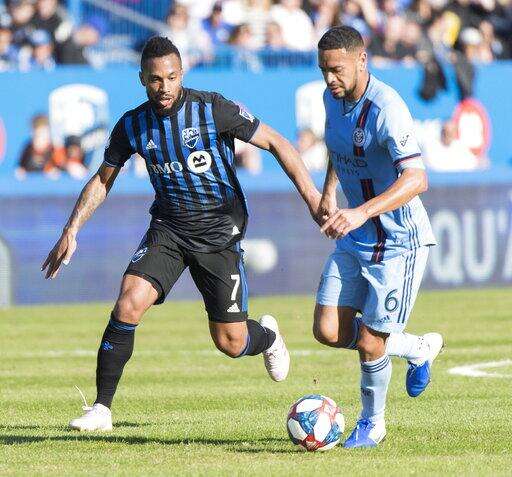 Montreal Impact's Harry Novillo, right, challenges New York City FC's Maxime Chanot during first half of an MLS soccer game in Montreal, Saturday, May 4, 2019. (Graham Hughes/The Canadian Press via AP)