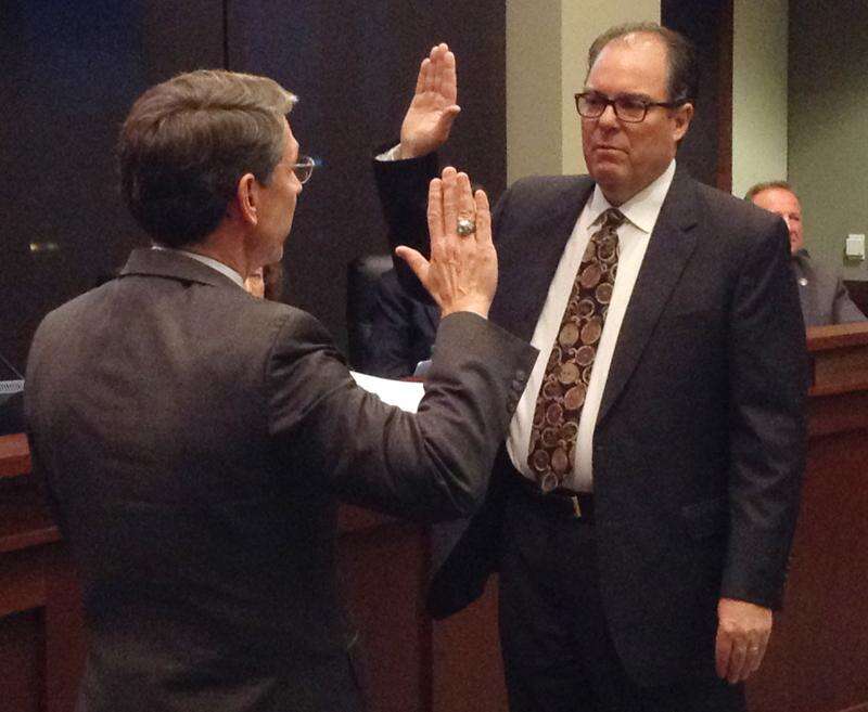 Mayor Tom Hayes, who swore in the trustees, presented the newcomers with village logo pins from his personal collection, "circa early 1990s," he said.