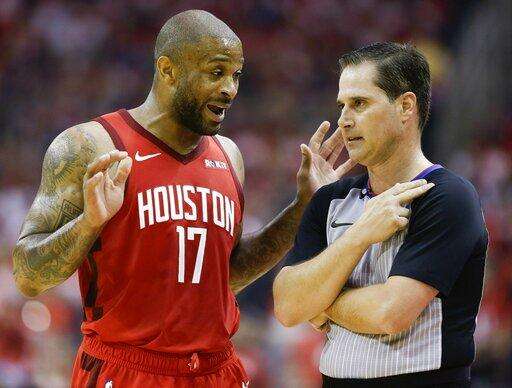 Houston Rockets forward PJ Tucker (17) argues a call with referee David Guthrie during the first half of Game 4 of a second-round NBA basketball playoff series against the Golden State Warriors, Monday, May 6, 2019, in Houston. (AP Photo/Eric Christian Smith) The Associated Press