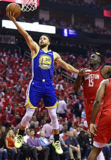 Golden State Warriors guard Stephen Curry (30) drives to the basket past Houston Rockets center Clint Capela (15) during the first half of Game 4 of a second-round NBA basketball playoff series, Monday, May 6, 2019, in Houston. (AP Photo/Eric Christian Smith) The Associated Press