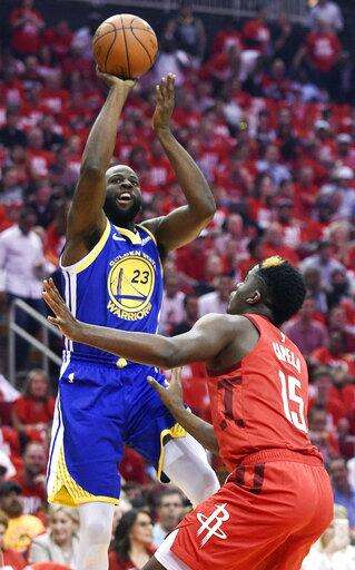 Golden State Warriors forward Draymond Green (23) shoots over Houston Rockets center Clint Capela during the first half of Game 4 of a second-round NBA basketball playoff series, Monday, May 6, 2019, in Houston. (AP Photo/Eric Christian Smith) The Associated Press