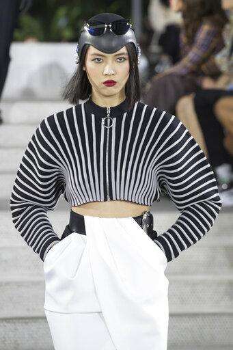 But for this show, Ghesquière seemed to be inspired by the glamour of the 1980s; models walked down the expansive two-level runway in satin-like miniskirts accented with a billowing top layer; a white leather jacket that had black lower sleeves with a checkered print looked like it could have fit in any video from the early days or MTV. One black suit dress with pinstripes had its shoulders cut out, so there were no shoulder pads, but the piece gave a nod to the 80s with its poofy sleeves. And several skirts had the ribbon pattern of the era.