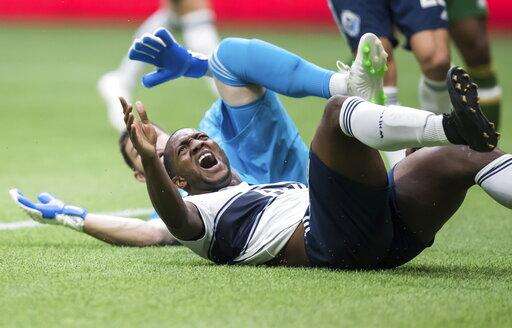Vancouver Whitecaps' Doneil Henry, front, reacts after nearly colliding with goalkeeper Maxime Crepeau, back, while defending against the Portland Timbers during the first half of an MLS soccer match Friday, May 10, 2019, in Vancouver, British Columbia. (Darryl Dyck/The Canadian Press via AP)