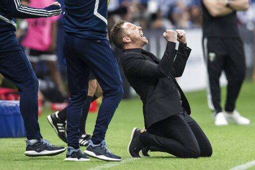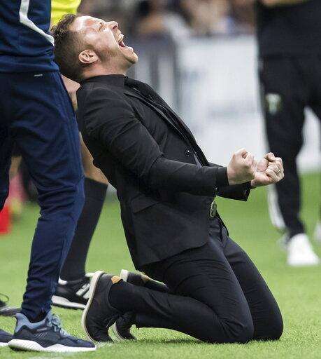Vancouver Whitecaps coach Marc Dos Santos celebrates after Vancouver defeated the Portland Timbers 1-0 during an MLS soccer match Friday, May 10, 2019, in Vancouver, British Columbia. (Darryl Dyck/The Canadian Press via AP)