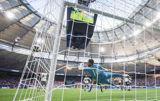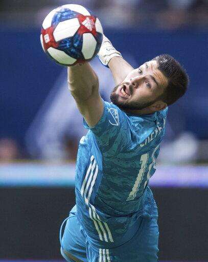 Vancouver Whitecaps goalkeeper Maxime Crepeau makes a save during the first half of an MLS soccer match against the Portland Timbers on Friday, May 10, 2019, in Vancouver, British Columbia. (Darryl Dyck/The Canadian Press via AP)