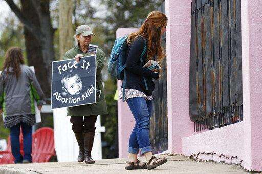 FILE - In this March 20, 2018, file photo, anti-abortion sidewalk counselors call out to a woman entering the Jackson Women's Health Organization's clinic, the only facility in the state that performs abortions, in Jackson, Miss. A new Mississippi law could make it nearly impossible for most pregnant women to get an abortion there if it survives a court challenge. (AP Photo/Rogelio V. Solis, File) The Associated Press