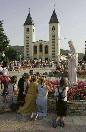 FILE - In this Saturday, June 24, 2006 file photo, pilgrims pray around a statue of the Virgin Mary during afternoon prayer service in front of the St James' Church at Medjugorje, Bosnia and Herzegovina, some 120 kilometers (75 miles) south of the Bosnian capital of Sarajevo. Pope Francis says pilgrimages can be organized to a Bosnian shrine where the Virgin Mary is reported to have appeared, but the Vatican is stressing that no decision has yet been taken on whether the apparitions in Medjugorje are authentic (AP Photo/Amel Emric, File) The Associated Press