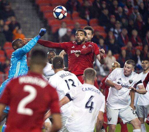D.C. United goalkeeper Bill Hamid, left, knocks the ball away from Toronto FC forward Jordan Hamilton, center, during the second half of an MLS soccer game, Wednesday, May 15, 2019 in Toronto. (Nathan Denette/The Canadian Press via AP)