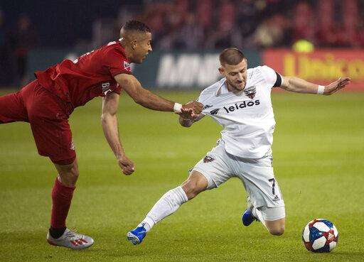 Toronto FC forward Jordan Hamilton, left, eyes the ball against D.C. United midfielder Russell Canouse, right, during the second half of an MLS soccer game, Wednesday, May 15, 2019 in Toronto. (Nathan Denette/The Canadian Press via AP)