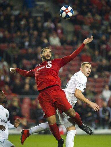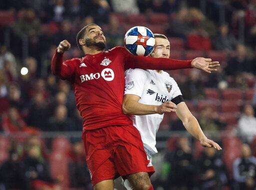 Toronto FC forward Jordan Hamilton, left, eyes then ball against D.C. United midfielder Russell Canouse, right, during the second half of an MLS soccer game, Wednesday, May 15, 2019 in Toronto. (Nathan Denette/The Canadian Press via AP)