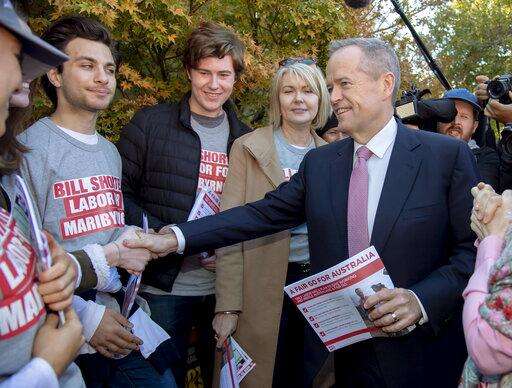 Australian Labor Party leader Bill Shorten, right, shakes hands with supporters at a polling station for a federal election in Melbourne, Australia, Saturday, May 18, 2019. Political leaders continued frenetic 11th-hour campaigning as Australians vote on Saturday in an election likely to deliver the nation's sixth prime minister in as many years. (AP Photo/Andy Brownbill) The Associated Press