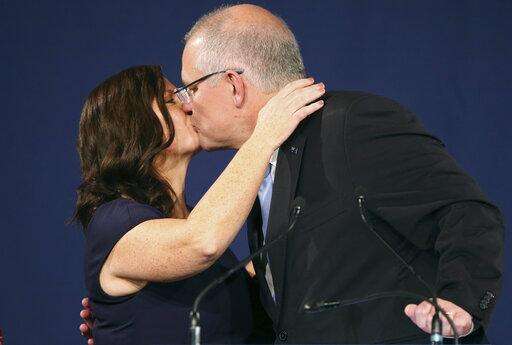 Australian Prime Minister Scott Morrison, right, kisses his wife, Jenny, after his opponent conceded defeat in the federal election in Sydney, Australia, Sunday, May 19, 2019. Australia's ruling conservative coalition, lead by Morrison, won a surprise victory in the country's general election, defying opinion polls that had tipped the center-left opposition party to oust it from power and promising an end to the revolving door of national leaders. (AP Photo/Rick Rycroft) The Associated Press