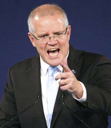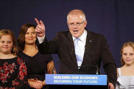 Australian Prime Minister Scott Morrison gestures as he speaks to party supporters after his opponent concedes defeat in the federal election in Sydney, Australia, Sunday, May 19, 2019. Australia's ruling conservative coalition, lead by Morrison, won a surprise victory in the country's general election, defying opinion polls that had tipped the center-left opposition party to oust it from power and promising an end to the revolving door of national leaders. (AP Photo/Rick Rycroft) The Associated Press
