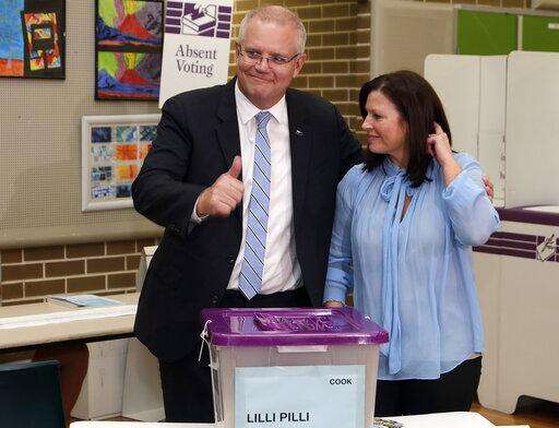 Australian Prime Minister Scott Morrison, left, is assisted by his wife, Jenny, as he casts his ballot in a federal election in Sydney, Australia, Saturday, May 18, 2019. Political leaders continued frenetic 11th-hour campaigning as Australians vote on Saturday in an election likely to deliver the nation's sixth prime minister in as many years. (AP Photo/Rick Rycroft) The Associated Press