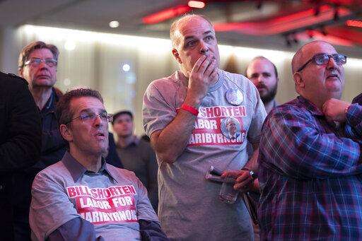 Labor party supporters watch the tally count at the Federal Labor Reception in Melbourne, Australia, Saturday, May. 18, 2019. Voting has closed in Australia's general election, with some senior opposition lawmakers confident that they will form a center-left government with a focus on slashing greenhouse gas emissions. (AP Photo/Andy Brownbill) The Associated Press