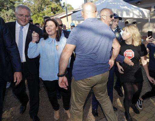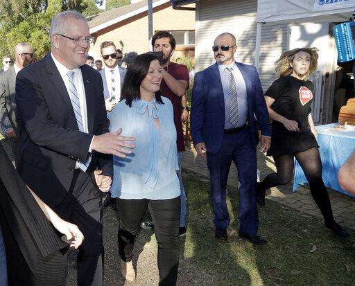 Australian Prime Minister Scott Morrison, left, holds his wife Jenny's hand as an anti-coalmining protester runs in from the right after Morrison voted in a federal election in Sydney, Australia, Saturday, May 18, 2019. Political leaders continued frenetic 11th-hour campaigning as Australians vote on Saturday in an election likely to deliver the nation's sixth prime minister in as many years. (AP Photo/Rick Rycroft) The Associated Press
