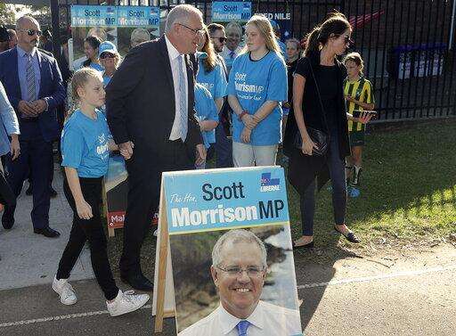 Australian Prime Minister Scott Morrison, center, leaves a polling station after casting his ballot in a federal election in Sydney, Australia, Saturday, May 18, 2019. Both major parties are promising that whoever wins the election the leader will remain prime minister until he next faces the voters' judgment. The parties have changed their rules to make the process of lawmakers replacing a prime minister more difficult. (AP Photo/Rick Rycroft) The Associated Press