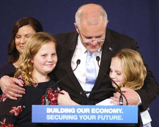 Australian Prime Minister Scott Morrison, center, embraces his daughters Lily, right, and Abbey, after his opponent concedes defeat in the federal election in Sydney, Australia, Sunday, May 19, 2019. Australia's ruling conservative coalition, lead by Morrison, won a surprise victory in the country's general election, defying opinion polls that had tipped the center-left opposition party to oust it from power and promising an end to the revolving door of national leaders. (AP Photo/Rick Rycroft) The Associated Press
