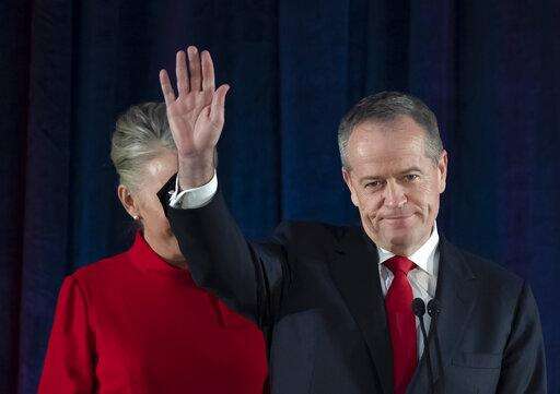 Australian Labor leader Bill Shorten gestures on stage with his wife Chloe, at the Federal Labor Reception in Melbourne, Australia, Saturday, May 18, 2019. Shorten has conceded defeat to Prime Minister Scott Morrison in the country's general election. Shorten made the announcement to supporters of his opposition Labor party late Saturday night in Melbourne. (AP Photo/Andy Brownbill) The Associated Press