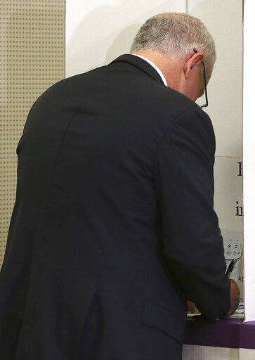 Australian Prime Minister Scott Morrison fills in his his ballot paper in a federal election in Sydney, Australia, Saturday, May 18, 2019. Political leaders continued frenetic 11th-hour campaigning as Australians vote on Saturday in an election likely to deliver the nation's sixth prime minister in as many years. (AP Photo/Rick Rycroft) The Associated Press