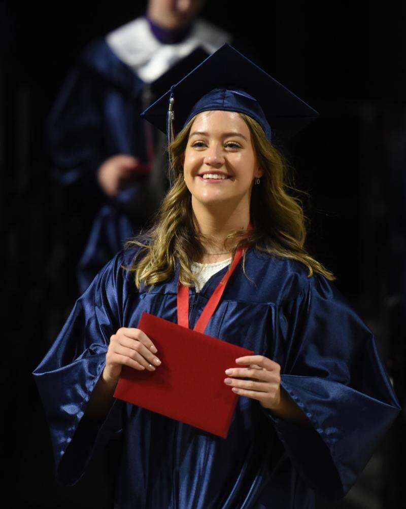 Andrea Michel celebrates during the processional of the South Elgin High School graduation at the Sears Centre in Hoffman Estates Saturday.
