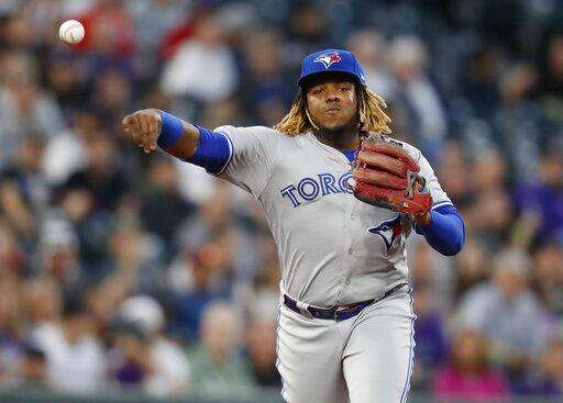 Toronto Blue Jays third baseman Vladimir Guerrero Jr. throws to first base to put out Colorado Rockies' Brendan Rodgers in the fourth inning of a baseball game Saturday, June 1, 2019, in Denver. (AP Photo/David Zalubowski) The Associated Press