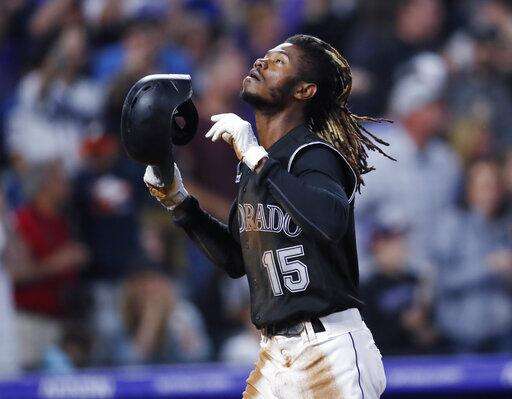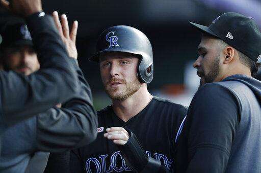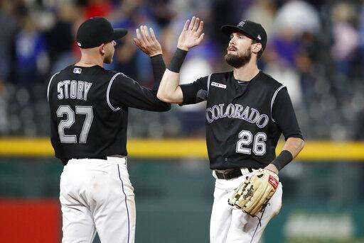 Colorado Rockies shortstop Trevor Story, left, and right fielder David Dahl congratulate one another after the team's baseball game against the Toronto Blue Jays on Saturday, June 1, 2019, in Denver. The Rockies won 4-2. (AP Photo/David Zalubowski) The Associated Press