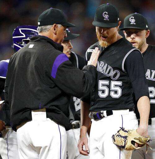 Colorado Rockies manager Bud Black, left, pats starting pitcher Jon Gray who leaves the mound after he issued back-to-back walks to the Toronto Blue Jays in the seventh inning of a baseball game Saturday, June 1, 2019, in Denver. (AP Photo/David Zalubowski) The Associated Press