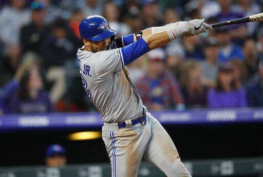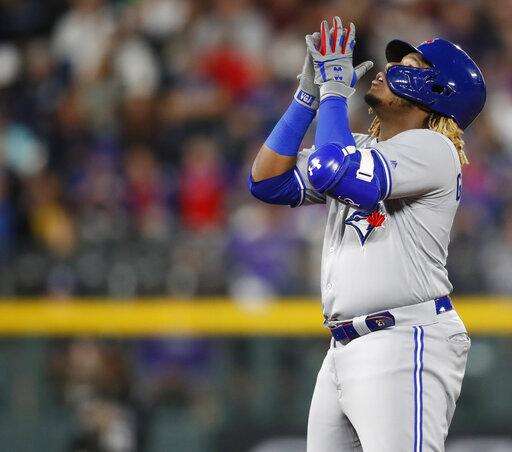Toronto Blue Jays' Vladimir Guerrero Jr. gestures after hitting a double off Colorado Rockies starting pitcher Jon Gray in the sixth inning of a baseball game Saturday, June 1, 2019, in Denver. (AP Photo/David Zalubowski) The Associated Press